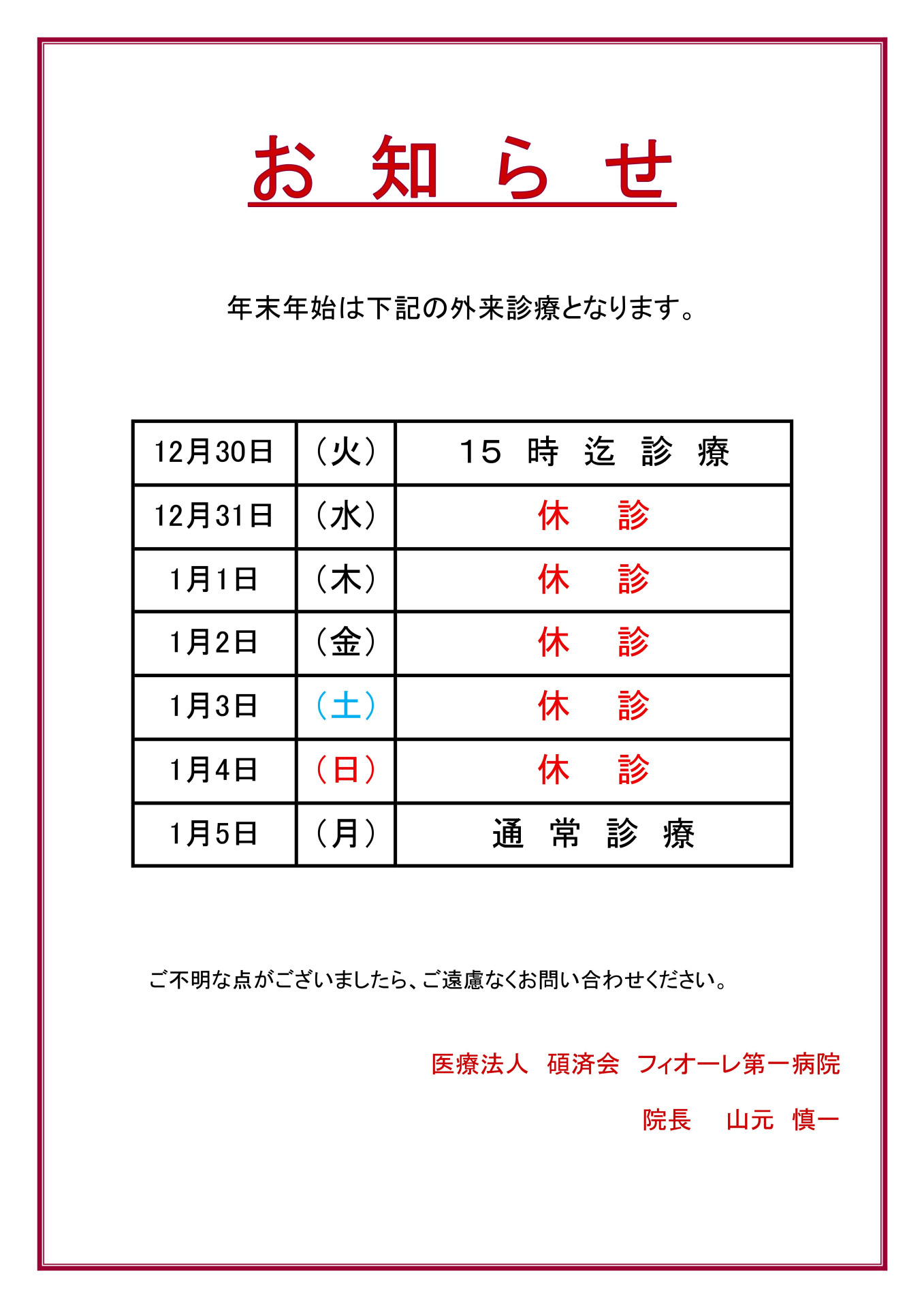 お知らせFIORE INFORMATION ホーム お知らせ 年末年始休診日のご案内 年末年始休診日のご案内 2025年12月02日 お知らせ一覧へ戻る Category Menu ご挨拶 予定表 お悩み掲示板 お問い合わせ お知らせ プライバシー・ポリシー スタッフ募集